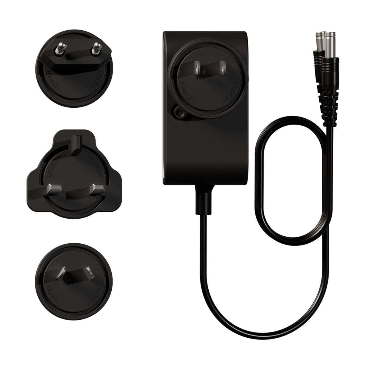 Oplader voor Hyperice Normatec Premier, laadt beide benen gelijktijdig op. De oplader wordt geleverd met adapters voor gebruik met verschillende stopcontactnormen.
